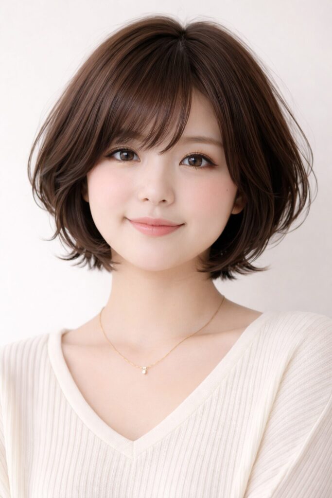 あごのラインで丸みを作り、毛先を少しだけ外にハネさせることで、